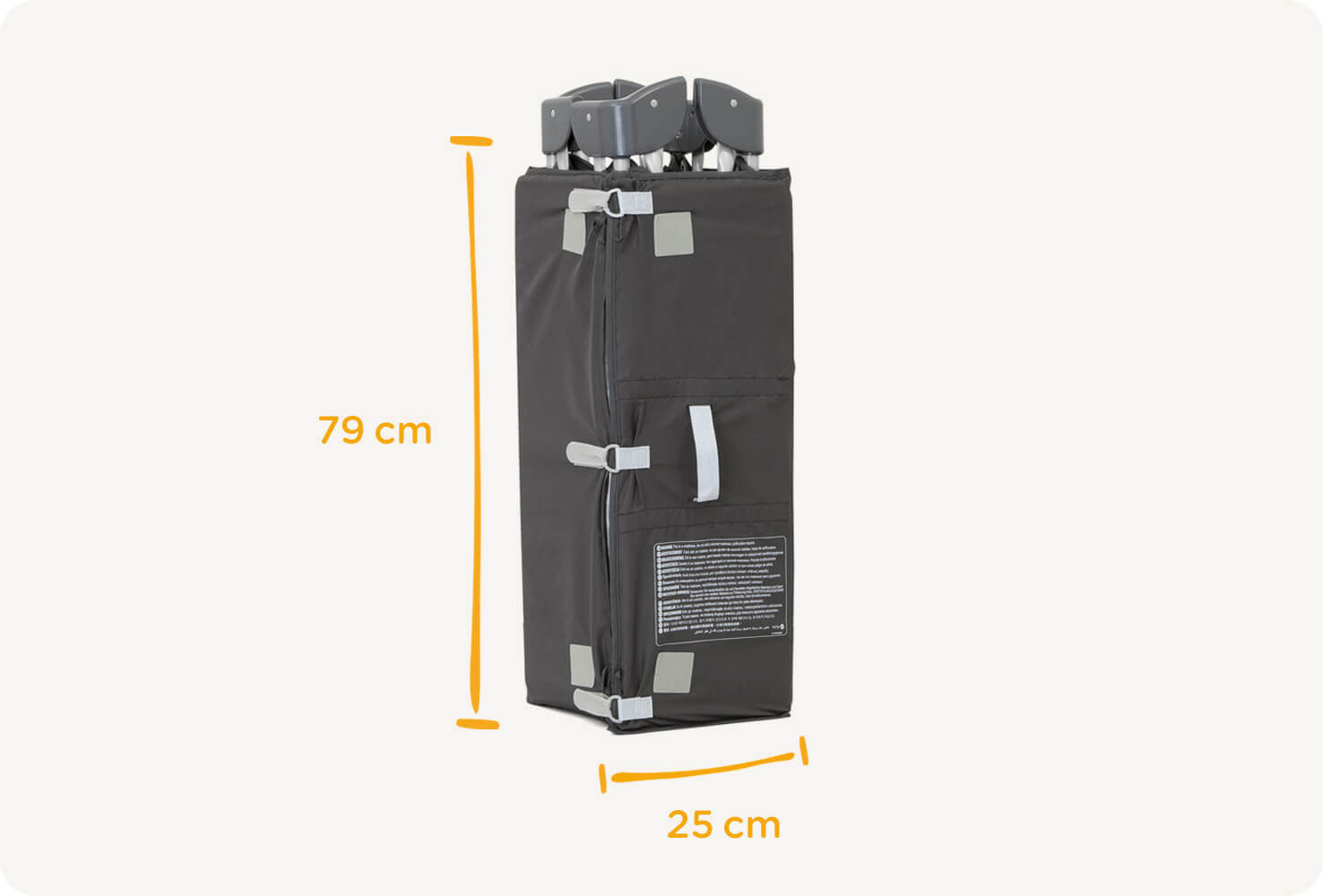 Travel and storage is simple with a cot that tucks away into a tidy, compact package so you can stow and go in a flash.